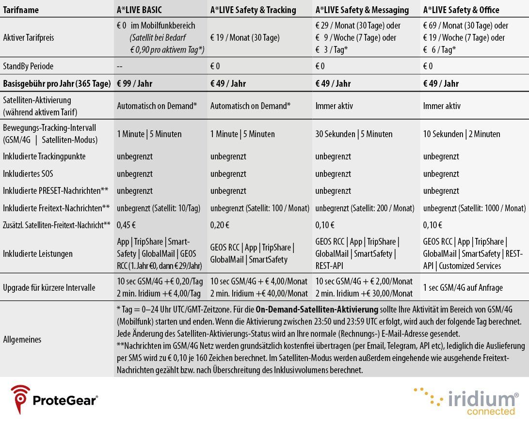 Für die Nutzung des A*LIVE benötigen Sie einen aktiven Datenplan; ProteGear stellt alle Datenpläne global zur Verfügung;