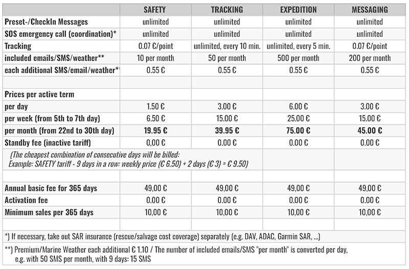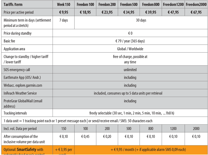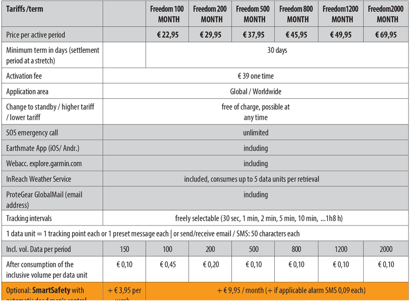 To activate the devices with InReach module, you need a data contract for the connection & communication to the Iridium satellite network. Data packages are billed monthly in advance by SEPA direct debit or credit card. Data consumption in excess of the respective inclusive volume ("overage") is billed retrospectively.