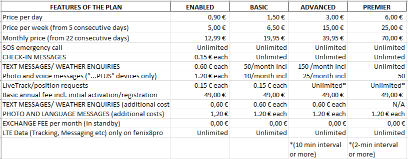 These data plans are compatible with all InReach devices manufactured since 2012. For the "Plus" devices (MessengerPlus, GPSMAP H1i Plus, Fenix 8 Pro), please use the new plans in the second table.
